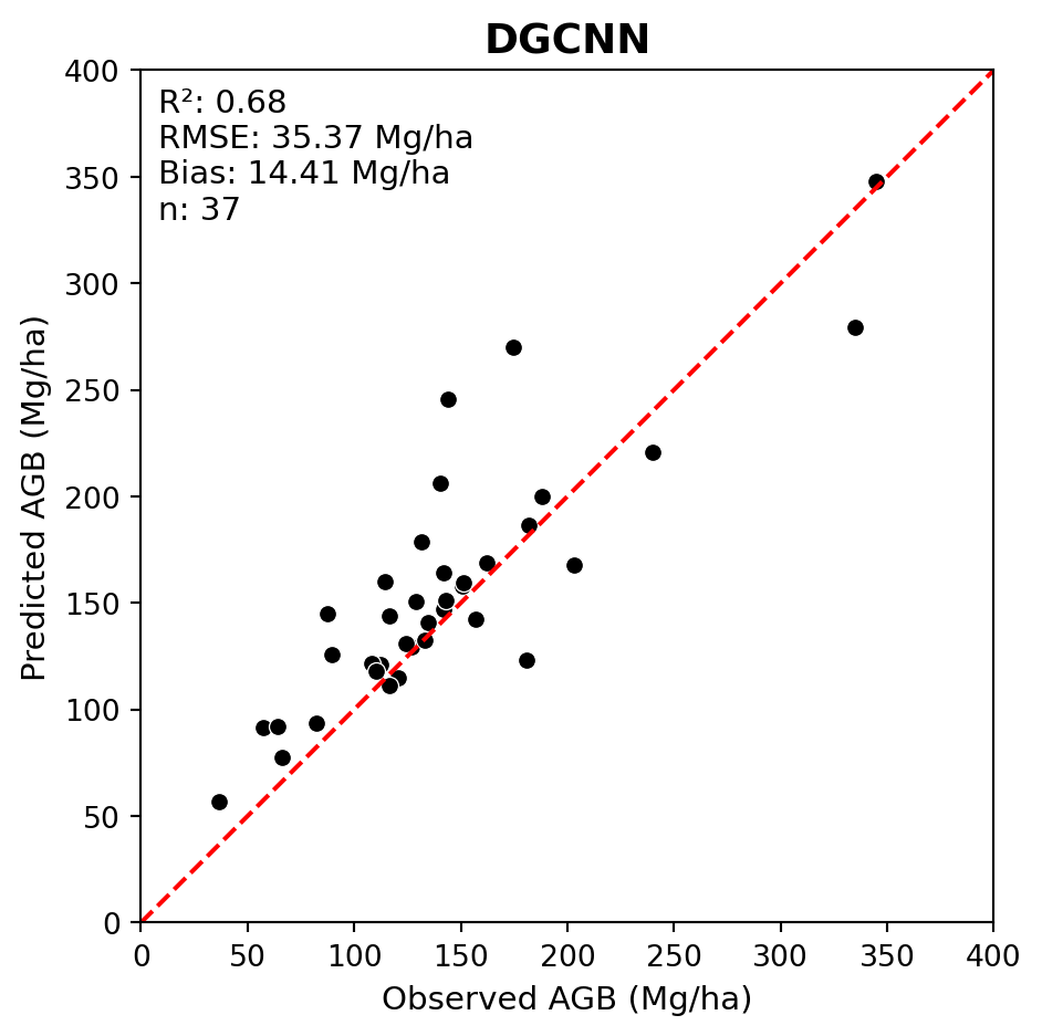 LABELS_FPATH =r'data/petawawa/labels.csv'dgcnn_pred_fpath =r'src/pretrained_ckpt/peta_reg_dgcnn_bs8_lre3/checkpoints/predictions.csv'# Read labelslabels_df = (pd.read_csv(LABELS_FPATH) .assign(plot_id=lambda df: df['plot_id'].str.upper()) .rename(columns={'total_agb_mg_ha': 'agb_mg_ha_obs'}))# Set mean and standard deviation for Z-score conversionmean_agb = labels_df['agb_mg_ha_obs'].mean()sd_agb = labels_df['agb_mg_ha_obs'].std()# Load DGCNN predictionsdgcnn_obs_pred_df = load_reg_pred(dgcnn_pred_fpath, labels_df, mean_agb, sd_agb)# Plot regression resultsplot_regression(obs=dgcnn_obs_pred_df['agb_mg_ha_obs'], pred=dgcnn_obs_pred_df['agb_mg_ha_pred'], ax_lims=(0, 400), title='DGCNN', fig_out_fpath='images/dgcnn_regression_plot.jpg', hide=False)