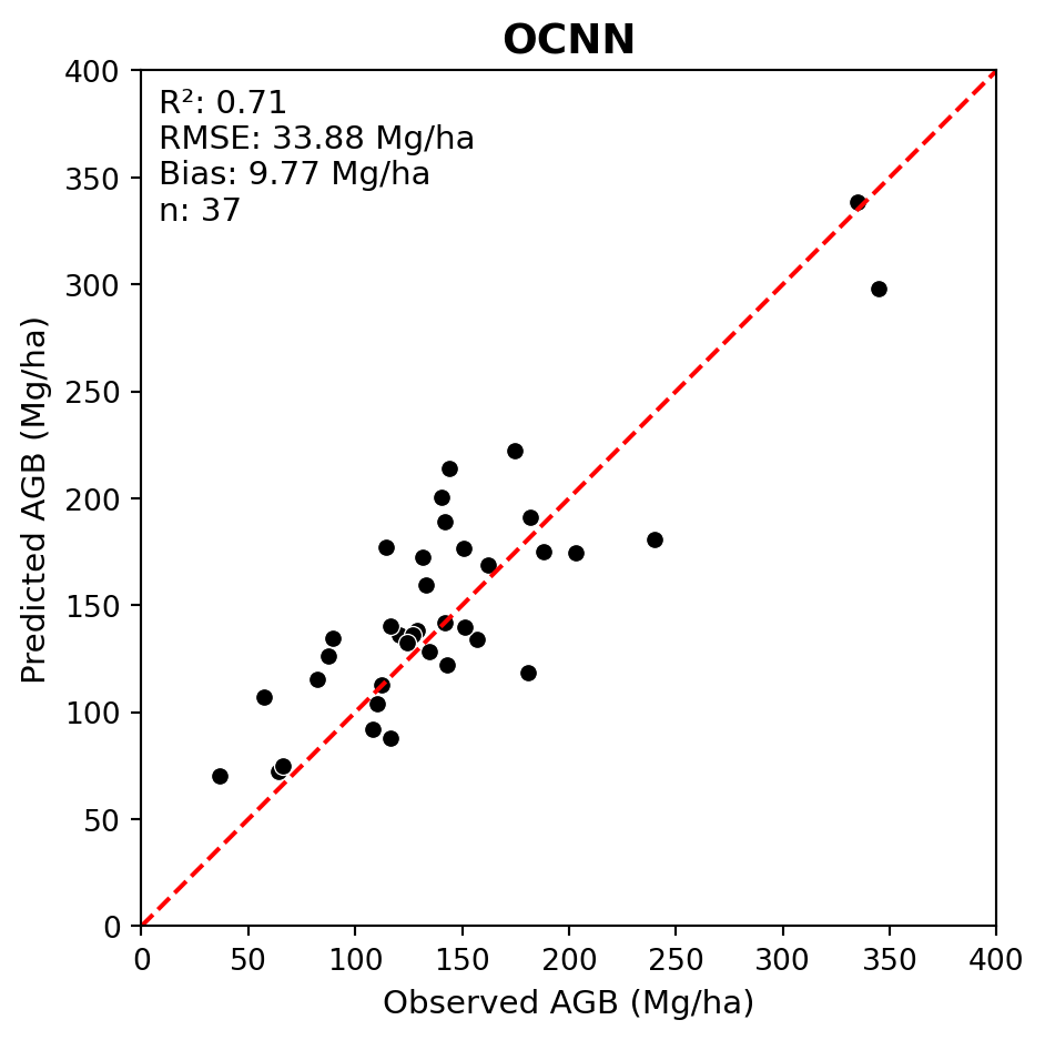 First, we can try a different DNN architecture that may be better suited to forest AGB regression. Some research has indicated that 3-D CNNs perform better for AGB estimation. For example, Oehmcke et al. (2024) found that the Minkowski Engine sparse 3-D CNN outperformed point-based DNNs such as PointNet and KPConv for AGB regression.