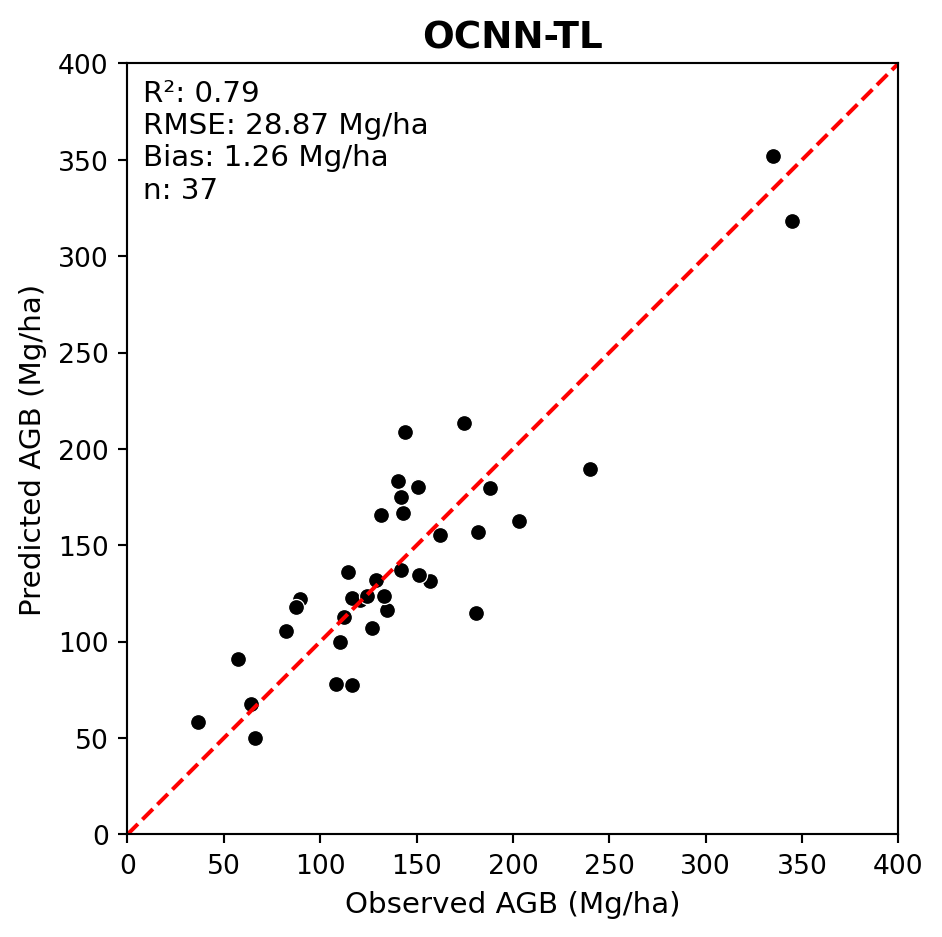 # Different model checkpointsocnn_tl_pred_fpath =r'src/pretrained_ckpt/peta_reg_ocnn_bs16_lre4_ckpt_ocnn_nbk_idXM6D/checkpoints/predictions.csv'ocnn_tl_obs_pred_df = load_reg_pred(ocnn_tl_pred_fpath, labels_df, mean_agb, sd_agb)plot_regression(obs=ocnn_tl_obs_pred_df['agb_mg_ha_obs'], pred=ocnn_tl_obs_pred_df['agb_mg_ha_pred'], ax_lims=(0, 400), title='OCNN-TL', fig_out_fpath='images/ocnn_tl_regression_plot.jpg', hide=False)