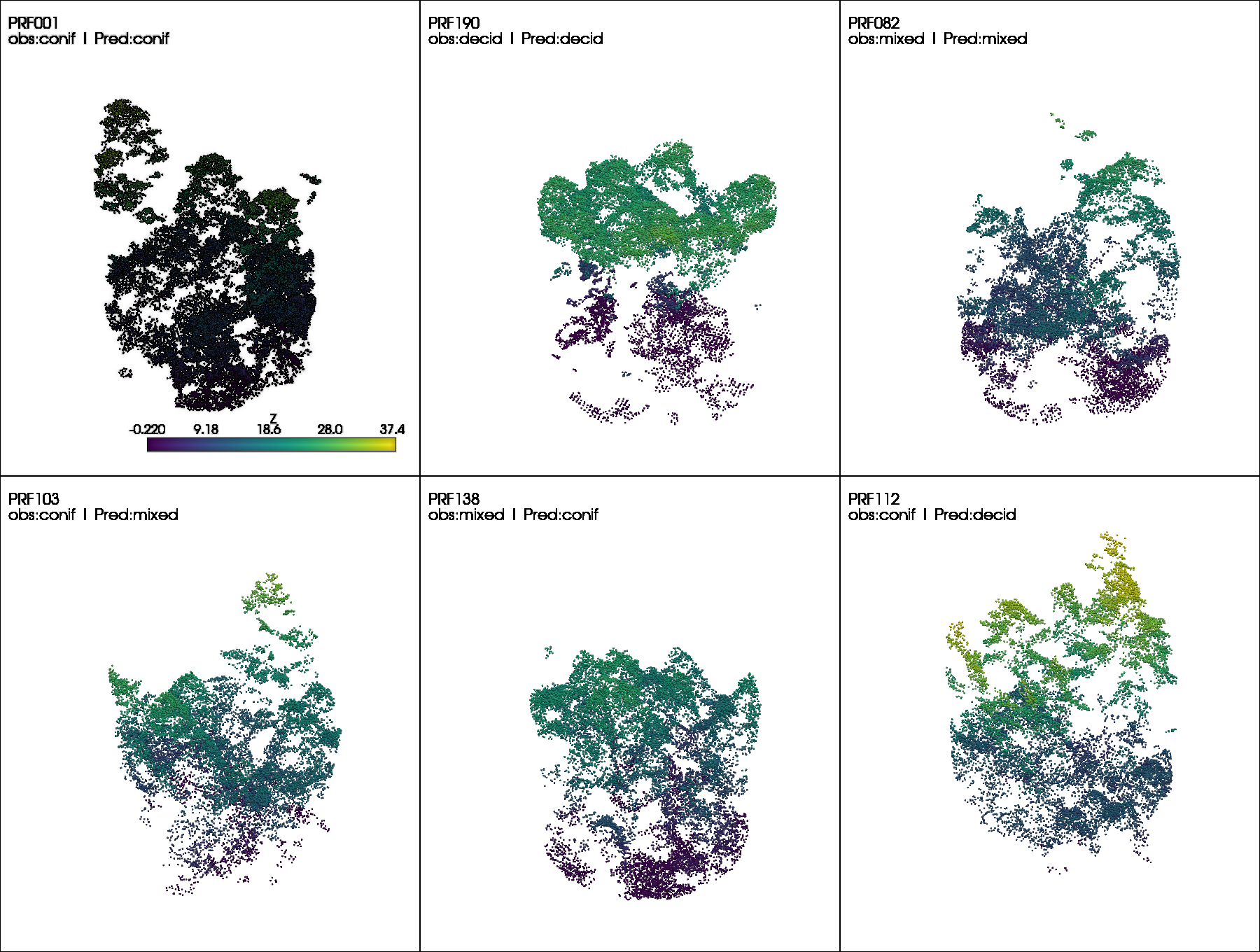 It is often beneficial to visualize individual examples to better understand model predictions. The figure below shows point cloud samples from the testing set, including correctly classified cases (top row) and misclassified cases (bottom row). Such visualizations help identify where errors occur and, when combined with domain knowledge, provide insight into potential causes of misclassification